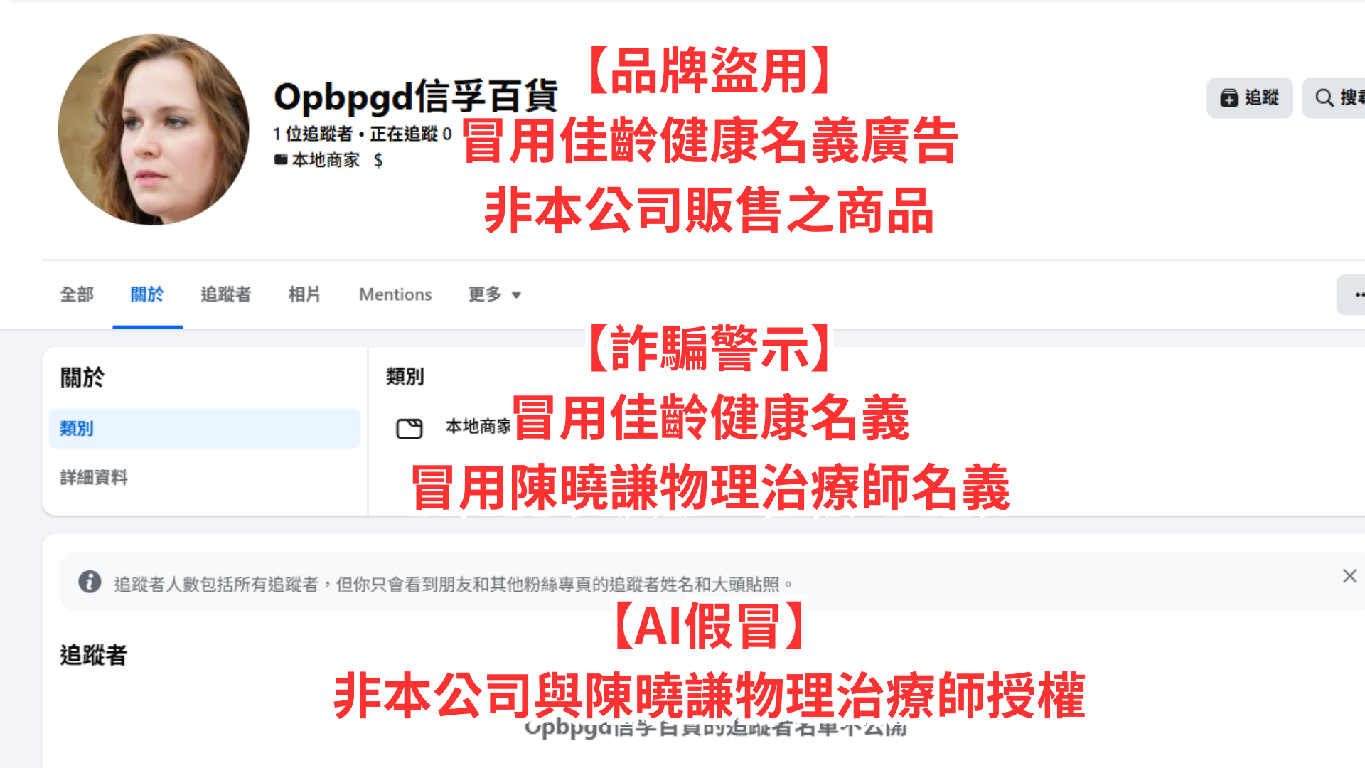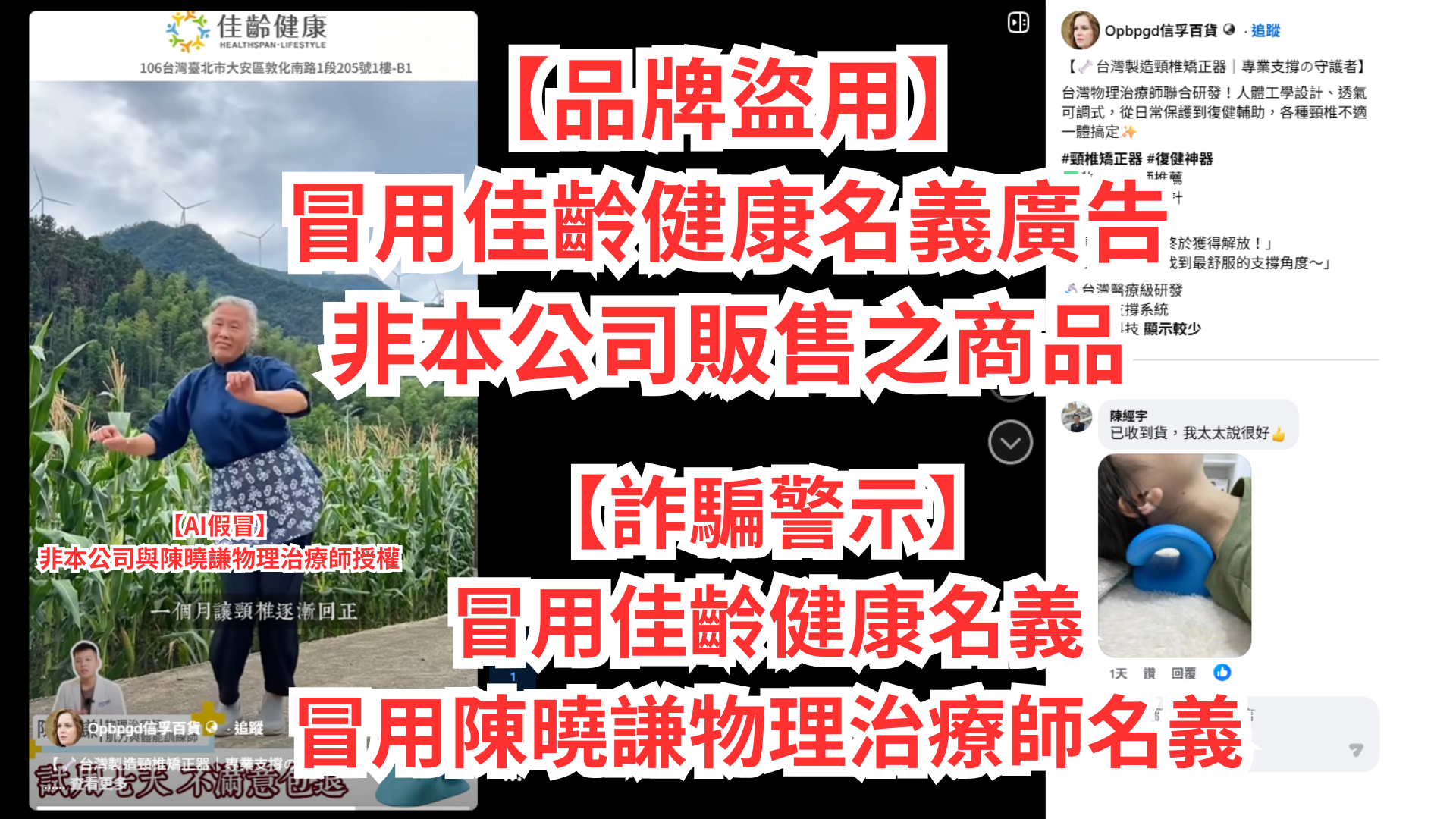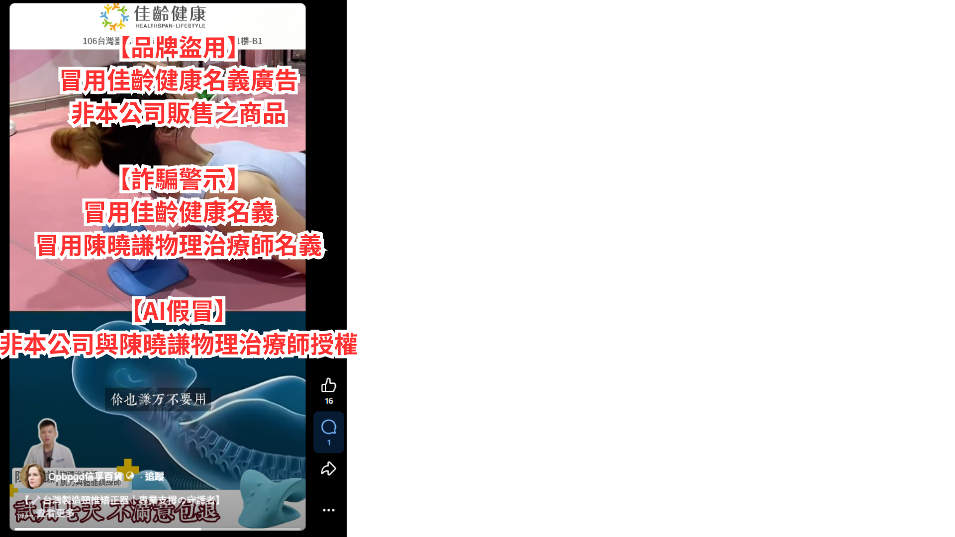 近日本公司發現有不肖人士未經授權,冒用本公司品牌名義,並利用 AI 生成「陳曉謙 物理治療師」之影像及相關內容,於 Facebook 等社群平台刊登廣告與販售所謂「頸椎矯正器」等商品,已嚴重混淆視聽並侵害本公司商譽與相關人員名譽。