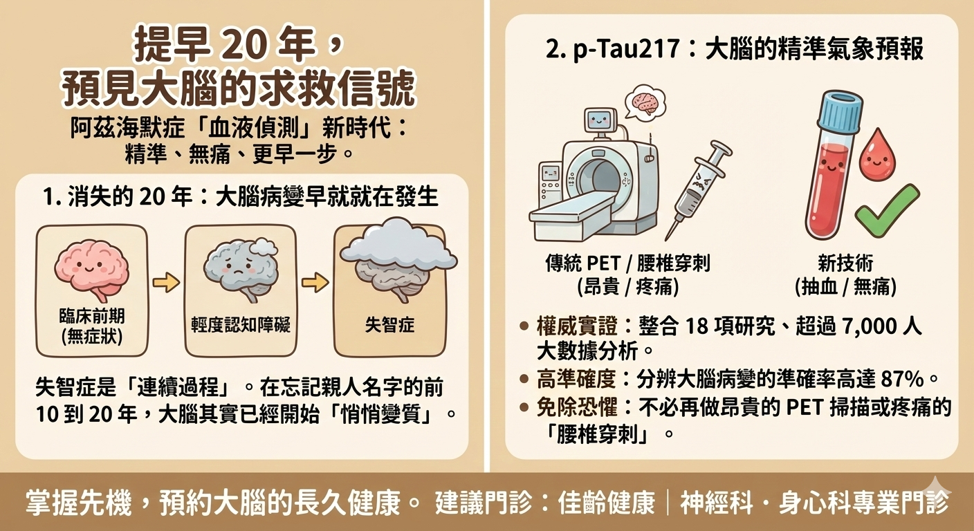 阿茲海默症不再是等到「忘記了」才處理的絕症,而是一種可以透過監控血液指標,提早十餘年就開始應對的慢性病 。