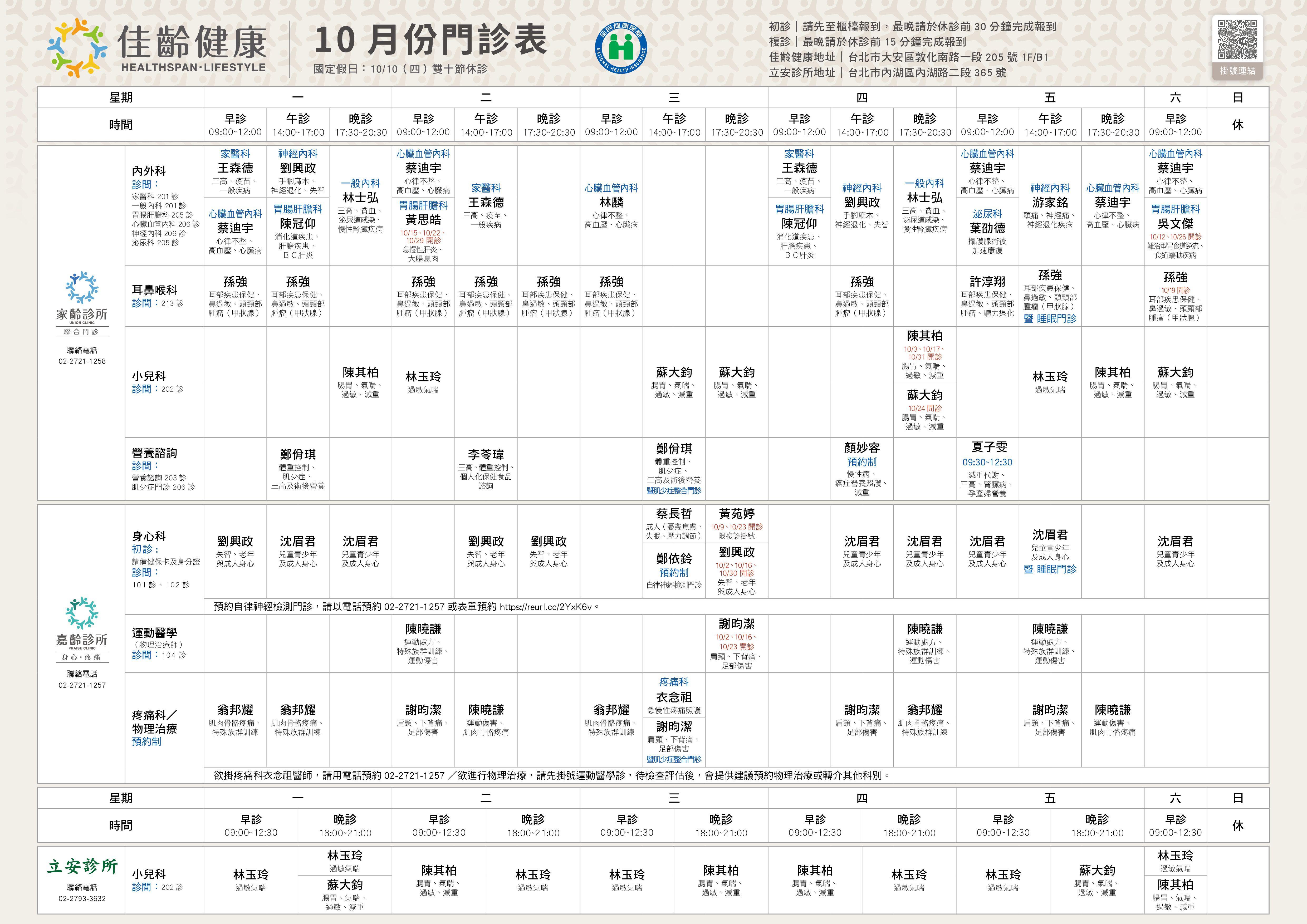 【家齡&嘉齡&立安診所】2024年10月門診表
