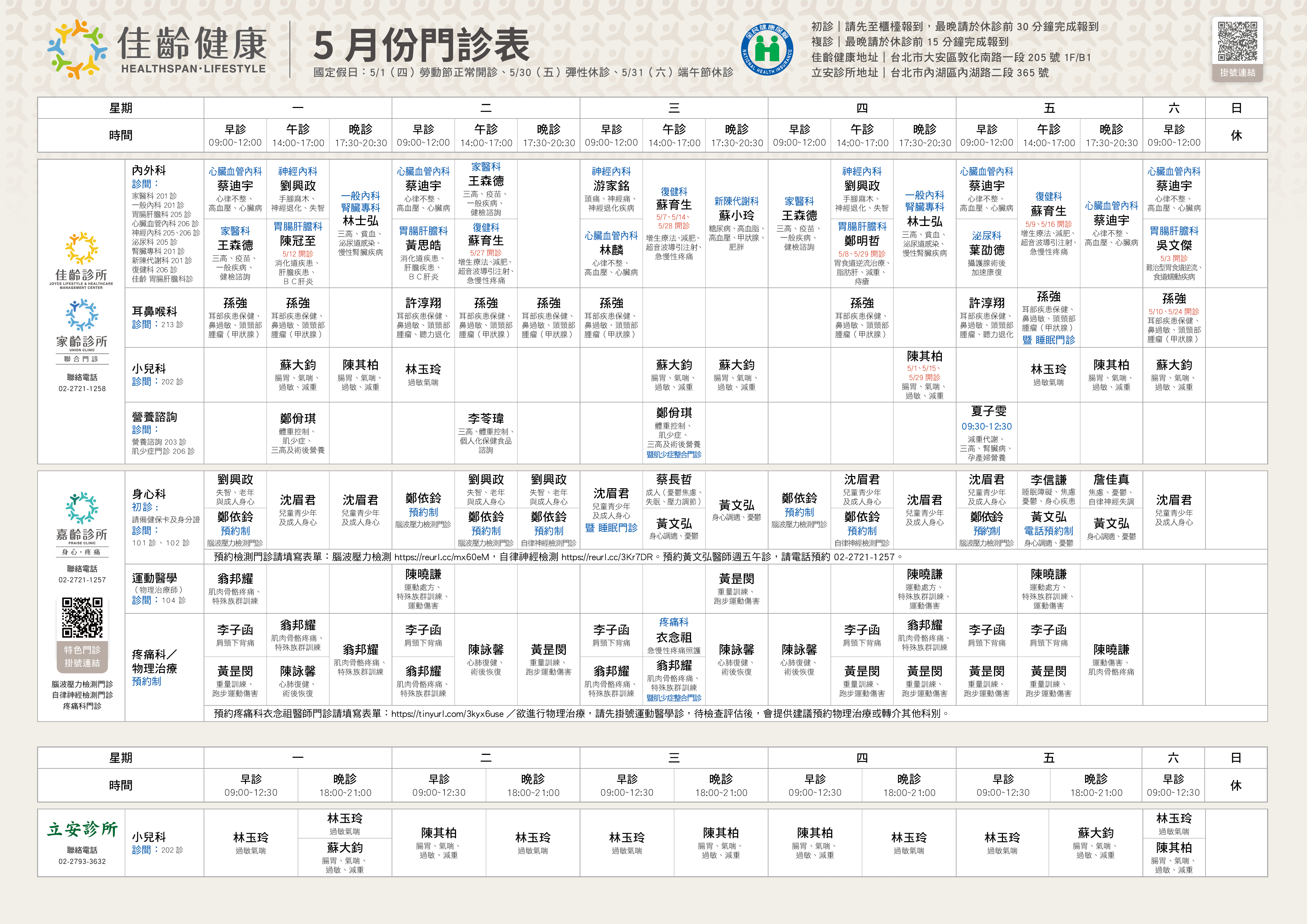 【家齡/嘉齡/立安診所】2025年5月門診表