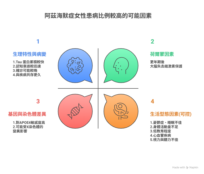 - X 染色體的問題:女性擁有兩條 X 染色體。在發育過程中,其中一條 X 染色體會被「關閉」(失去活性)。但在某些因素下,這條 X 染色體上的基因會出現「逃逸」(escape inactivation)的現象,重新具有活性表現。這些逃逸基因可能影響阿茲海默症的風險,但這方面的研究仍在進行中。