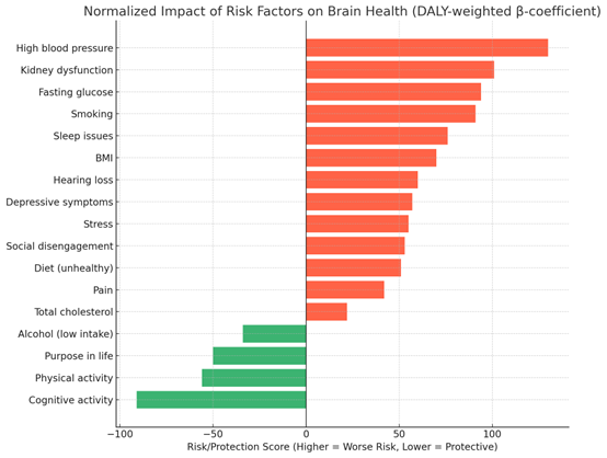研究進一步以「標準化β係數(normalised β-coefficient)」來量化每個因子對腦部疾病負擔的影響。結果如附圖所示:綠色負值表示保護效果,紅色正值代表風險增加。