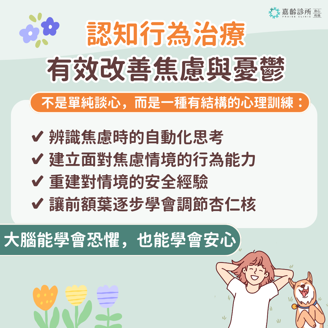 #認知行為治療#CBT#焦慮治療#憂鬱調適#情緒調節#前額葉訓練#大腦可塑性#團體心理治療#心理健康促進#嘉齡診所#身心科#心理諮商