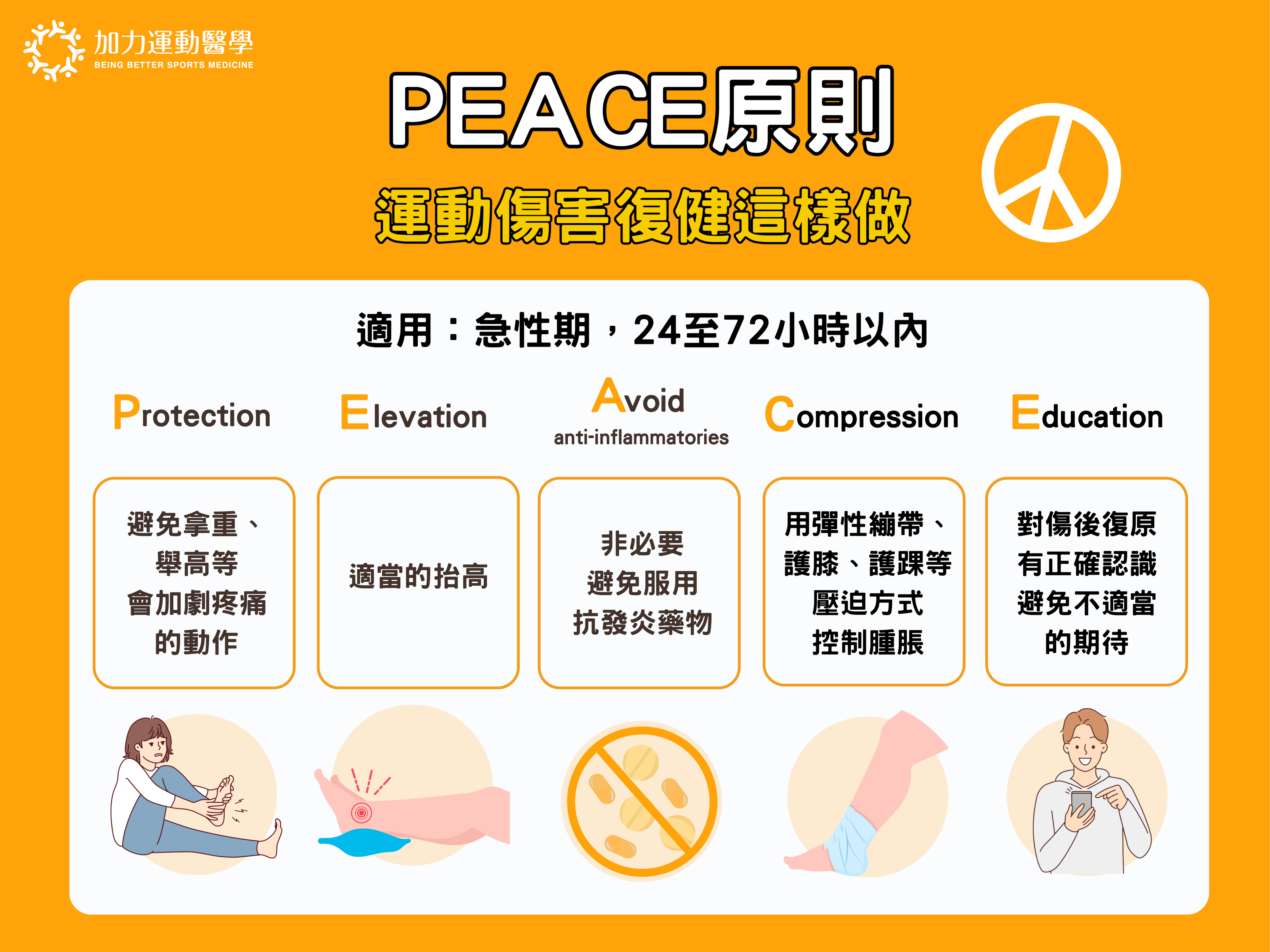 - 及早復健避免後遺症,採用PEACE & LOVE原則