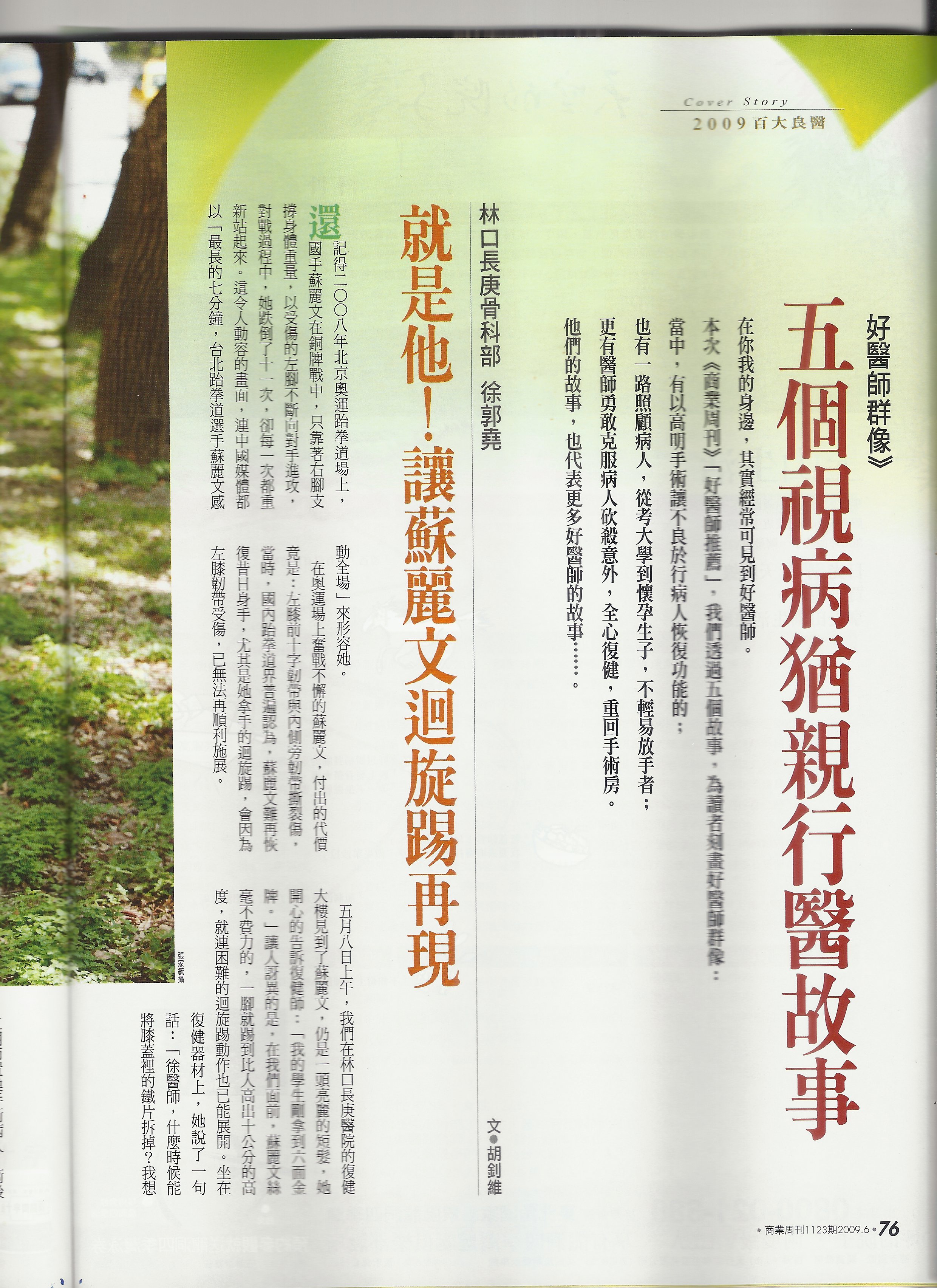 ▲徐郭堯醫師讓跆拳道國手蘇麗文迴旋踢再現,並榮獲《商業週刊》第1123期「2009百大良醫」。